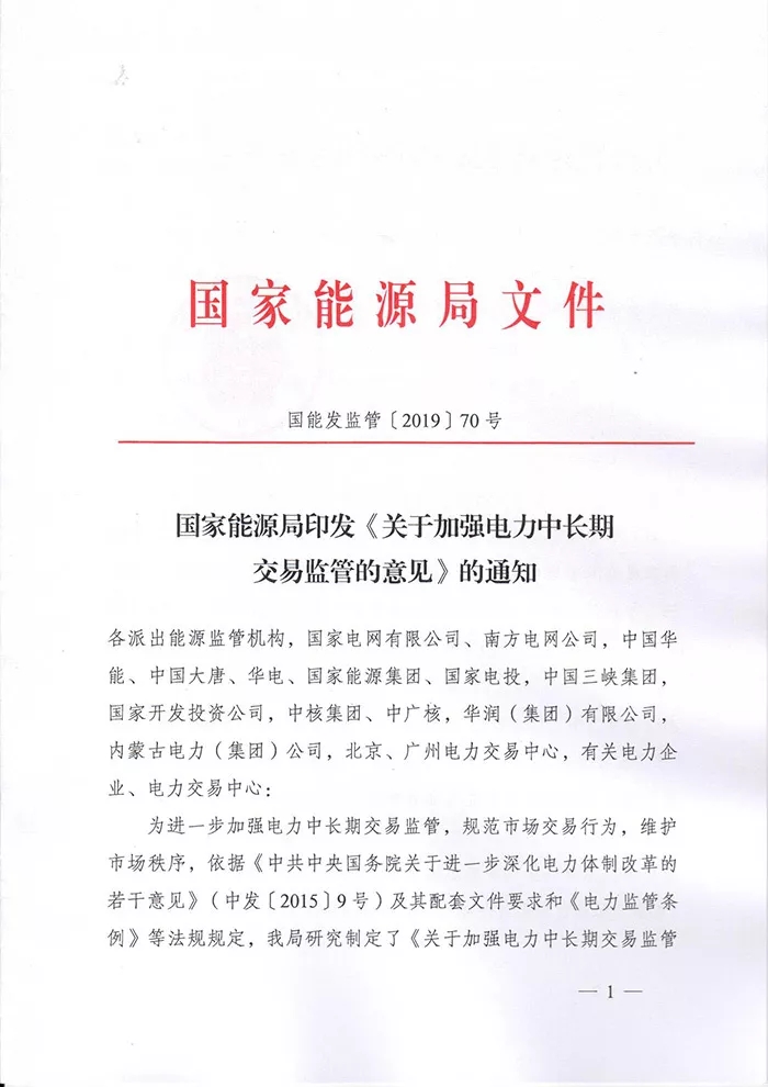 近日,国 家能源局印发《关于加强电力中长期交易监管的意见》的通知(国能发监管〔2019〕70号),旨在对电力市场交易规则执行和交易行为实施监管,进一步规范电力市场交易行为,维护公平竞争的市场秩序,加快推进电力市场化改革。
