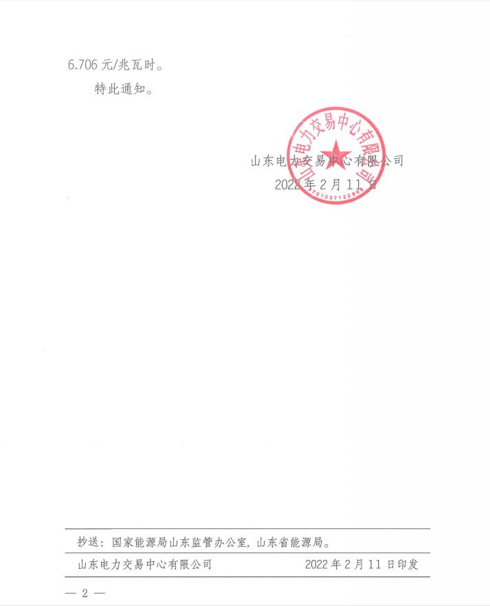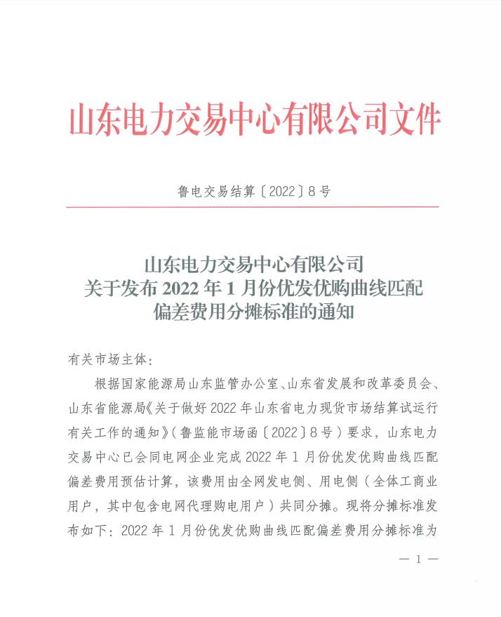 山东电力交易中心有限公司关于发布2022年1月份优发优购曲线匹配偏差费用分摊标准通知