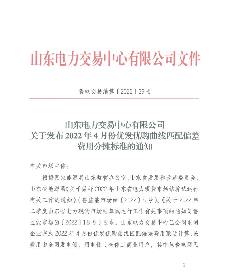 山东电力交易中心有限公司关于发布2022年4月份优发优购曲线匹配偏差费用分摊标准的通知