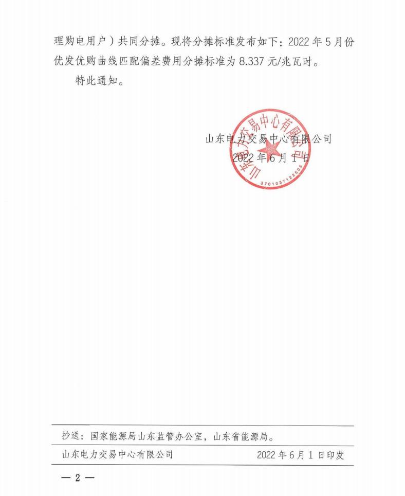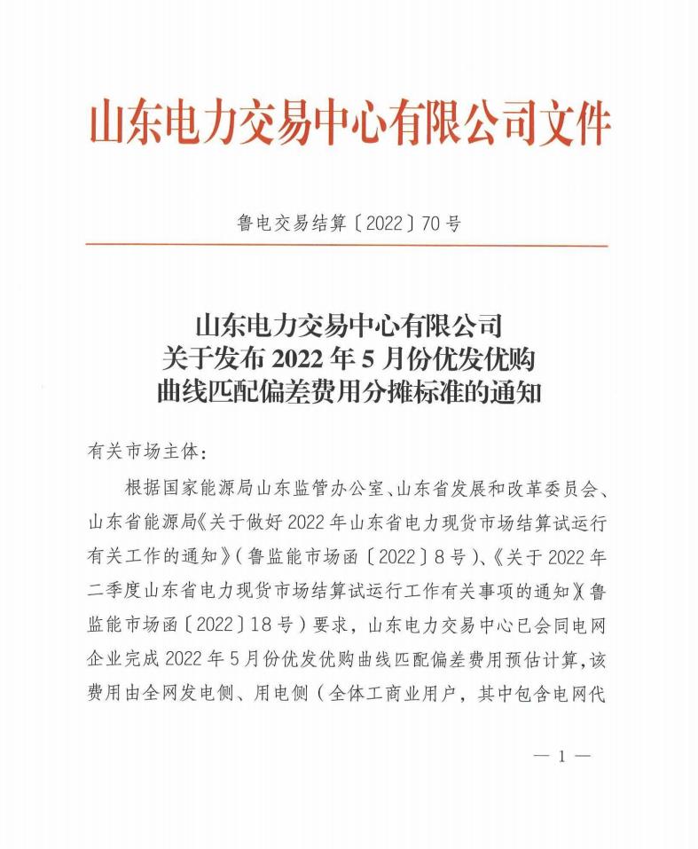 山东电力交易中心有限公司关于发布2022年5月份优发优购曲线匹配偏差费用分摊标准的通知