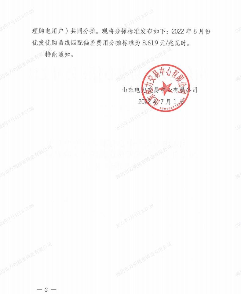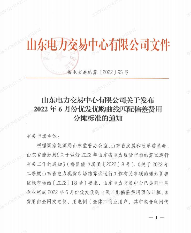 山东电力交易中心有限公司关于发布2022年6月份优发优购曲线匹配偏差费用分摊标准的通知