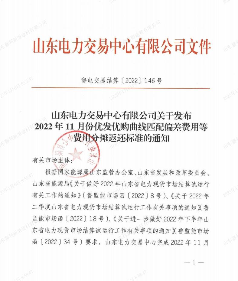 山东电力交易中心有限公司关于发布2022年11月份优发优购曲线匹配偏差费用等费用分摊返还标准的通知