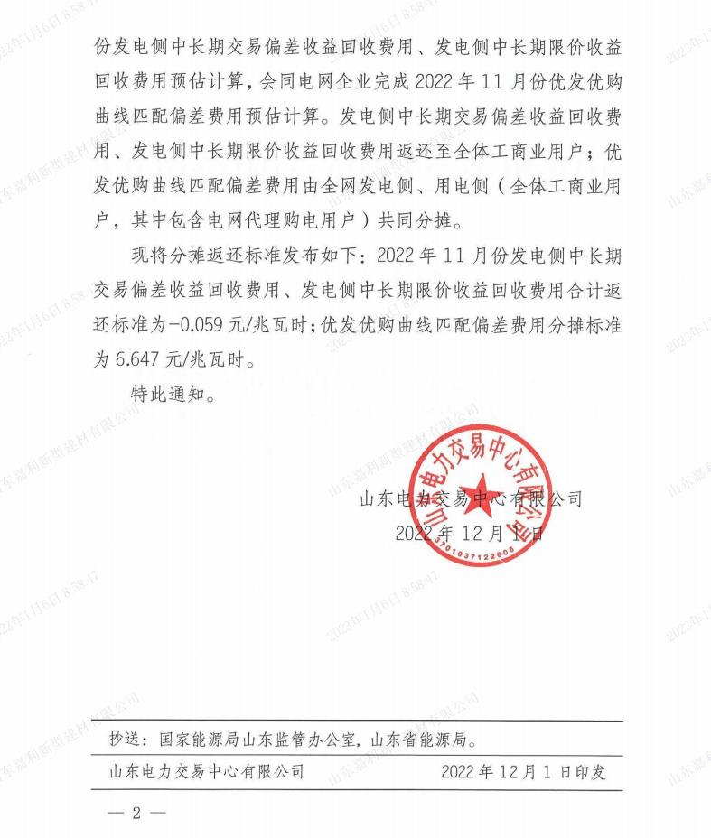 山东电力交易中心有限公司关于发布2022年12月份优发优购曲线匹配偏差费用等费用分摊返还标准的通知