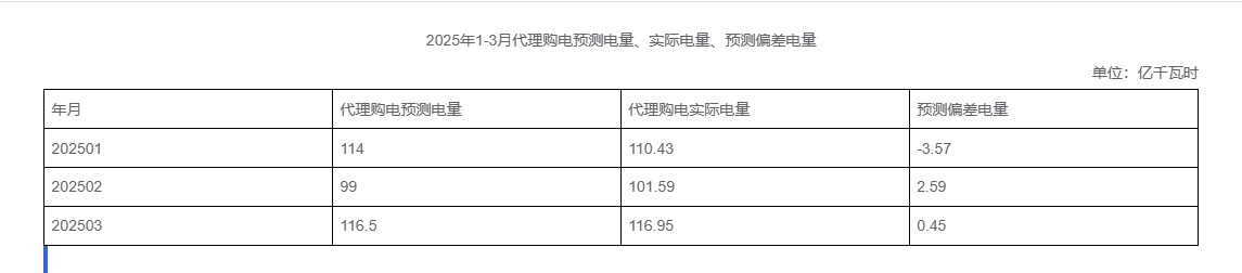 2025年1-3月代理购电预测电量、实际电量、预测偏差电量