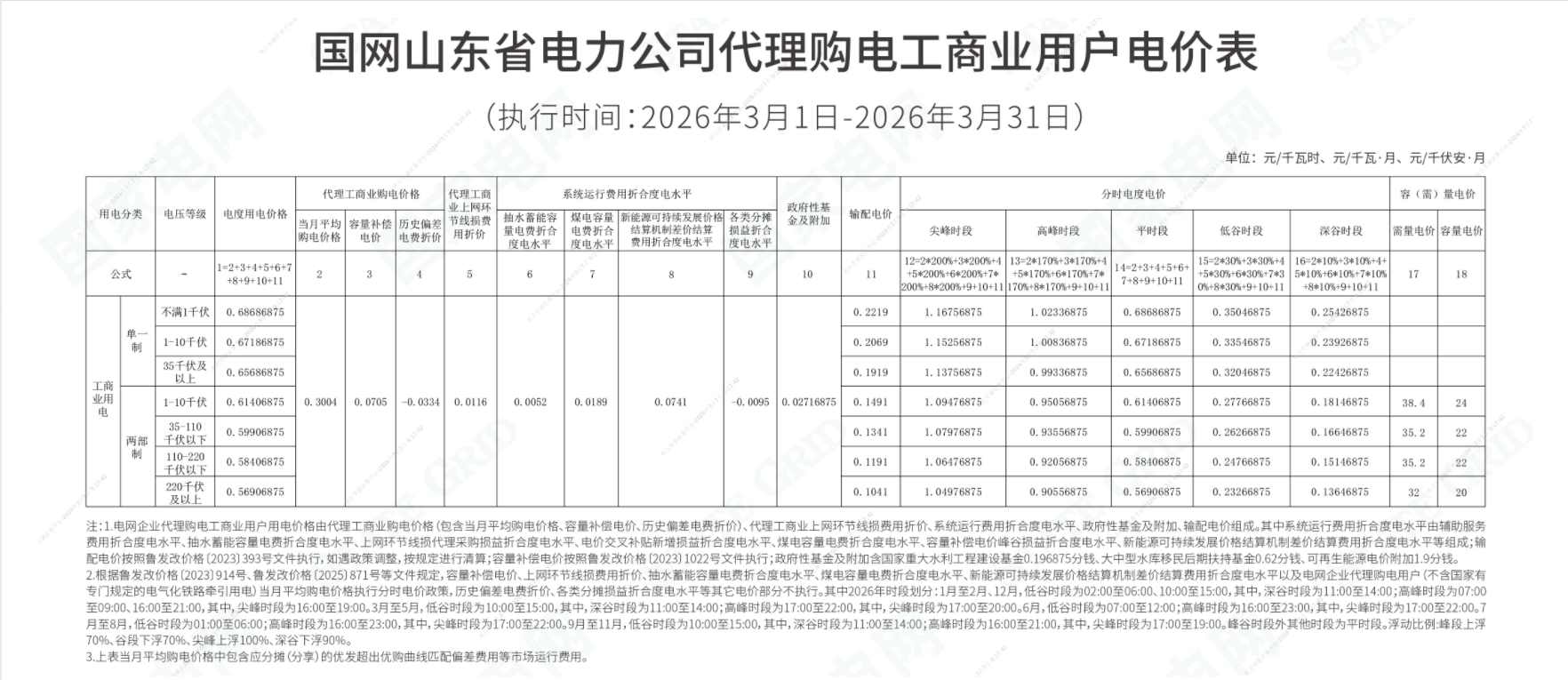 国网山东省电力公司代理购电工商业用户电价表
